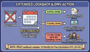 DMV is extending the “lookback” period. The lookback period is the window of time DMV uses to stack or aggregate points from moving violations when deciding whether to take action on a license or driving privilege.